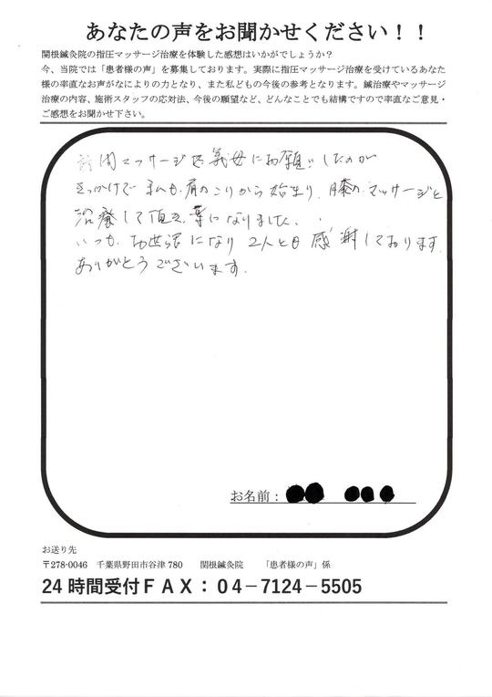 訪問マッサージを義母にお願いしたのがきっかけで、私も肩のこりから始まり、膝のマッサージを治療して頂き、楽になりました。