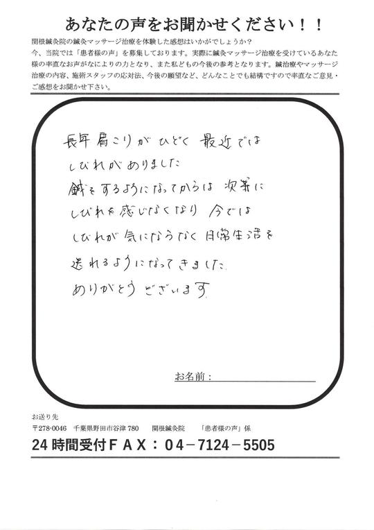 何十年も凝り固まっていた頚と肩が、鍼とマッサージのおかげで痛みと重苦しさがとれて、軽くなりました。