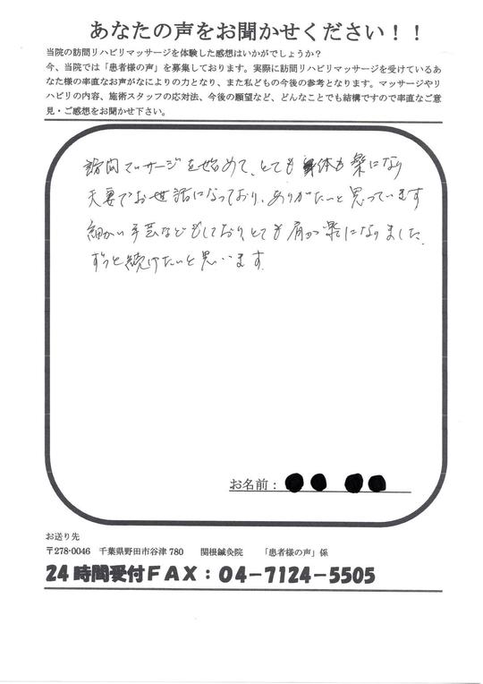 訪問マッサージを始めて、とても体が楽になり夫婦でお世話になっており、ありがたいと思っています。
