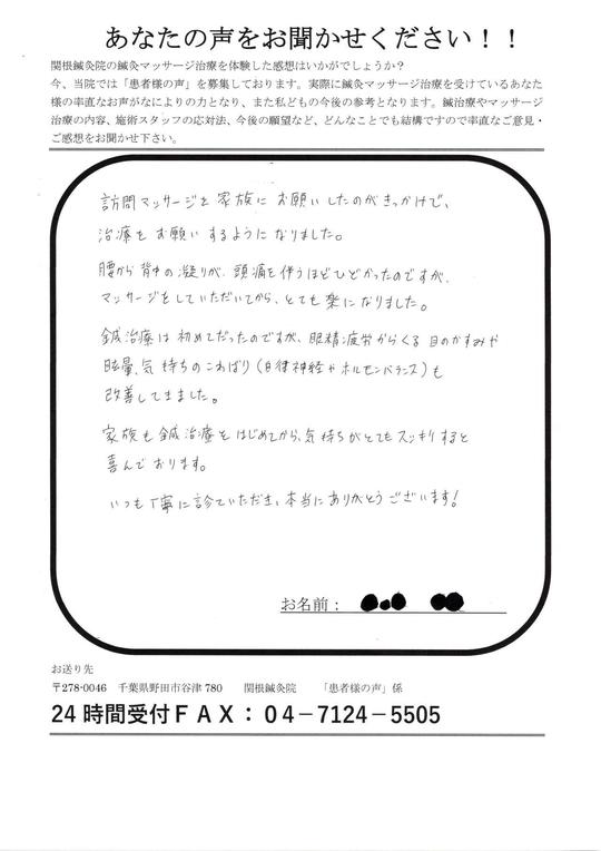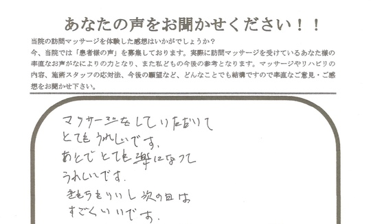 訪問マッサージを義母にお願いしたのがきっかけで、私も肩のこりから始まり、膝のマッサージを治療して頂き、楽になりました。