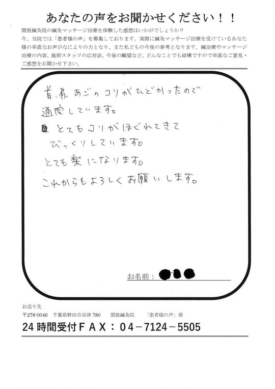 何十年も凝り固まっていた頚と肩が、鍼とマッサージのおかげで痛みと重苦しさがとれて、軽くなりました。