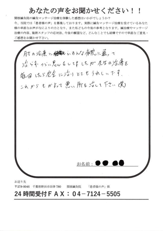 肘の治療にいろんな病院に通って治らず、つらい思いをしてましたが、先生の治療を数回したら完全に治り、とてもうれしいです。