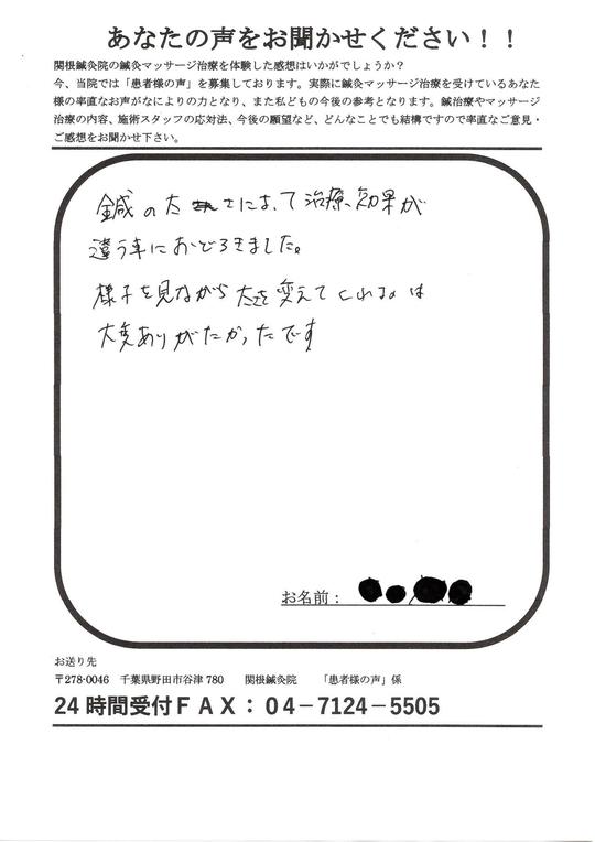 鍼をするようになってからは、次第に痺れを感じなくなり今では痺れが気にならなく日常生活を送れるようになってきました。