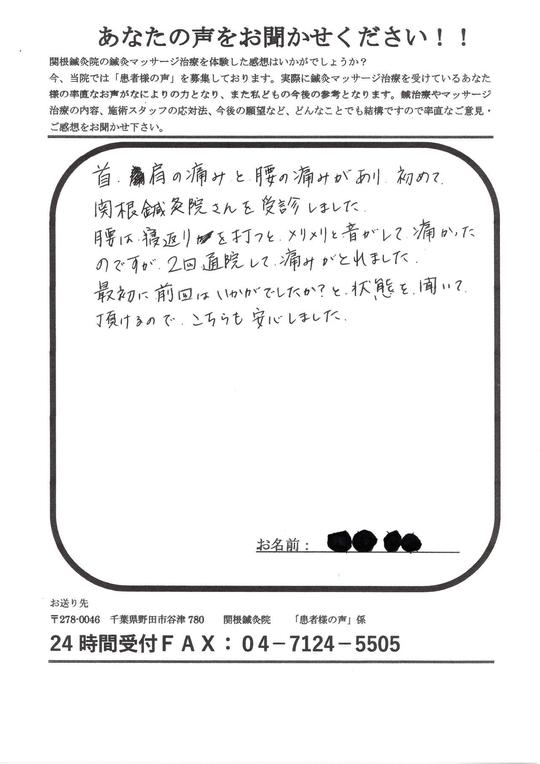 首肩の痛みと腰の痛みがあり、初めて関根鍼灸院さんを受診しました。