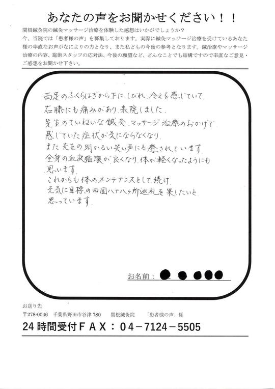 両足のふくらはぎから下にしびれ、冷えを感じていて、右膝にも痛みがあり来院しました。