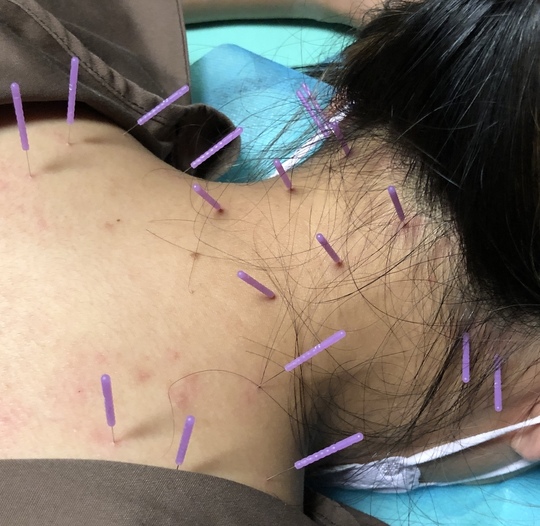 頚と肩の筋肉が硬くなり、血流が悪くなりますと発症しますので、頚と肩に鍼をうち筋肉を緩め血流を促進させていきます。