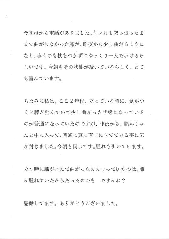今朝母から電話がありました。何ヶ月も突っ張ったままで曲がらなかった膝が、昨夜から少し曲がるようになり、歩くのも杖をつかずにゆっくり一人で歩けるらしいです。今朝もその状態が続いているらしく、とても喜んでいます。