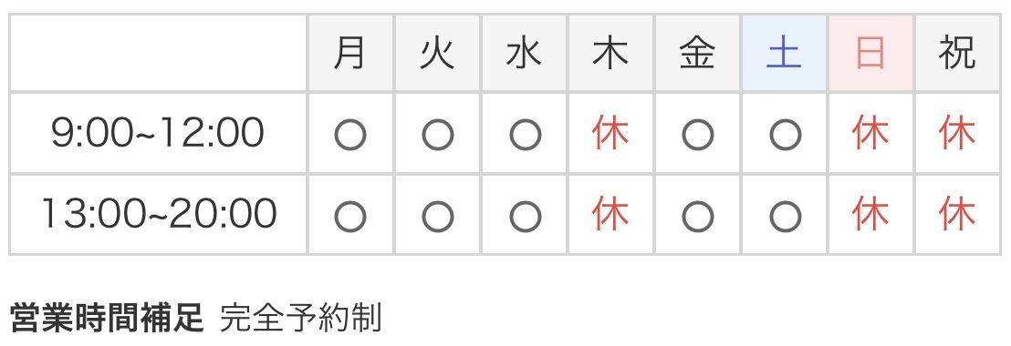 診療時間 | 月曜・火曜・水曜・金曜・土曜:9時から12時、13時から20時 完全予約制 |