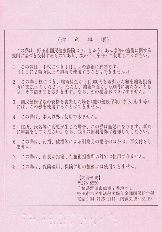 関根鍼灸院は野田市の指定施術所ですので、はり・きゅう・あん摩等施設利用助成券が使用できます。野田市の国民健康保険にご加入(満45歳以上75歳未満)の方は、野田市の「はり・きゅう・あん摩等施設利用助成券」が24000円分(1回使用できる1000円券が24枚、4月から3月までの1年間分)が、市役所の国保年金課、関宿支所、出張所(北コミュニティーセンター内、南コミュニティーセンター内、欅のホール内)にて無料で交付されます。