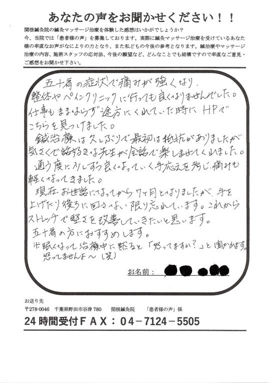 何十年も凝り固まっていた頚と肩が、鍼とマッサージのおかげで痛みと重苦しさがとれて、軽くなりました。